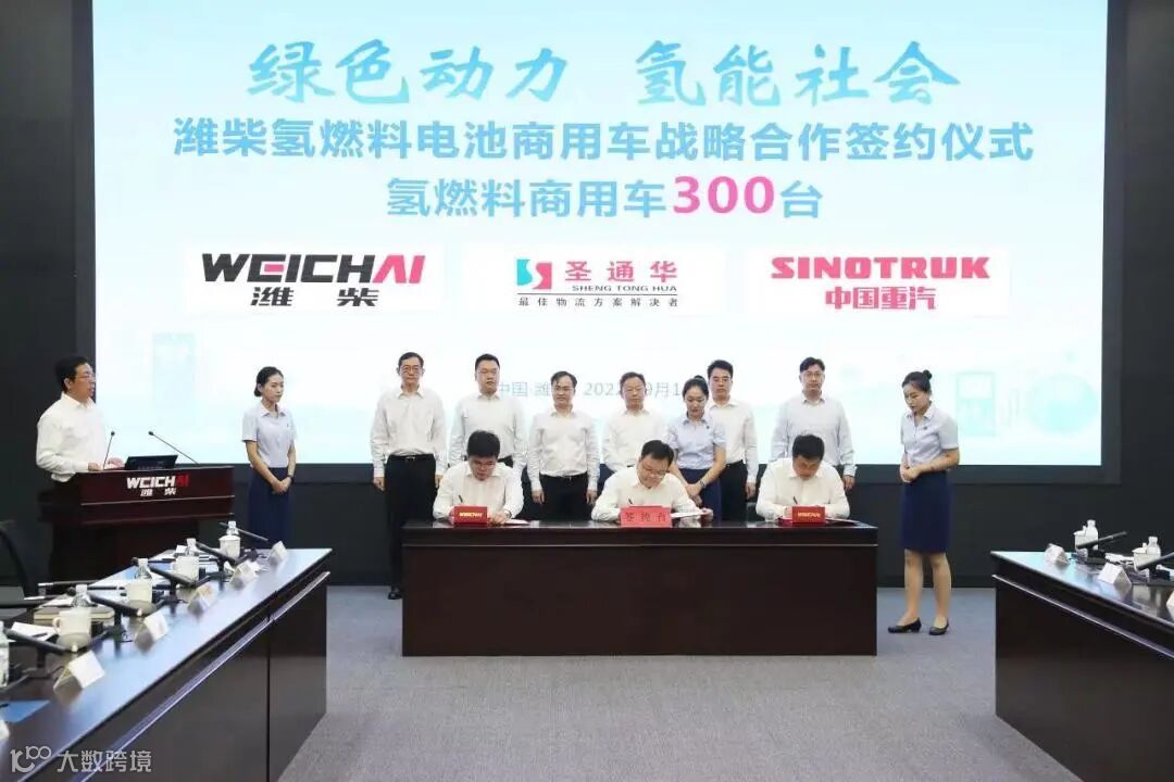 9月1日,潍柴动力举行氢燃料电池商用车战略合作签约仪式,各签约方就深化氢燃料电池在商用车领域的推广达成一致合作意向,加快推进物流运输场景的大规模商业化应用。据悉,未来3年内,潍柴动力将向青岛圣通华有限公司(简称圣通华)、淄博展鸿汽车有限公司、同心智行物流科技有限公司等客户,陆续交付共计1100台氢燃料电池商用车,用于城市配送、港口运输、城际运输等不同应用场景。