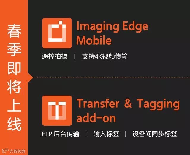 此外,新的移动端应用“Imaging Edge Mobile”和“Transfer & Taggingadd-on” 将于2019年3月上线。“ImagingEdge Mobile”移动端应用程序是“PlayMemories Mobile™”的后继版本,用户可以在拍摄时将图像从相机即时传输到连接的移动设备。使用新的“自动后台传输到智能手机”功能时,可以传输图像,使用户可以轻松地直接从手机分享内容到社交媒体平台,移动端应用程序还支持4K视频传输和遥控拍摄功能。