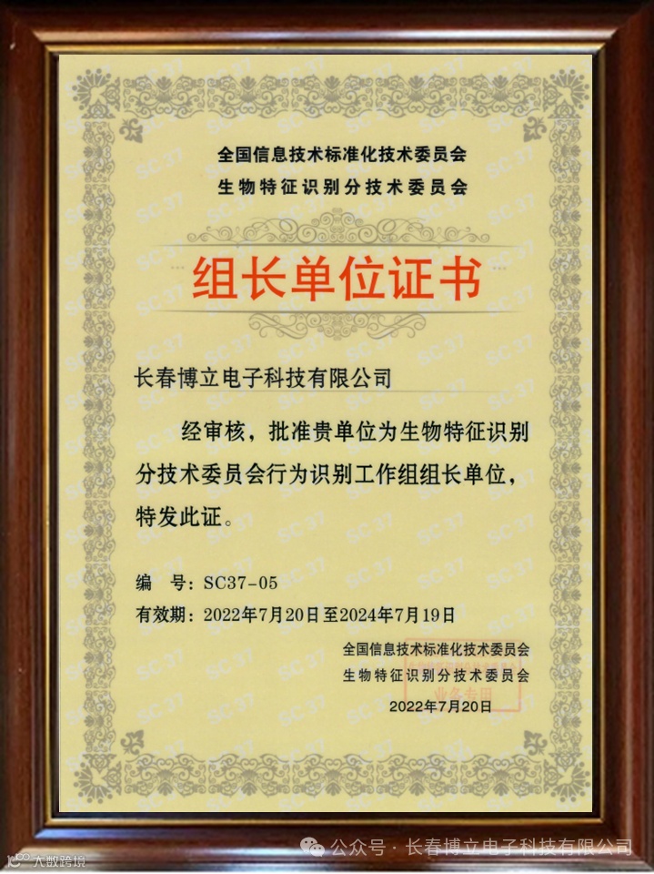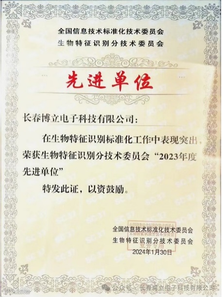 生物特征识别分委会程多福主任委员宣读了2023年度先进单位和先进个人获奖名单。长春博立电子科技有限公司荣获“生物特征识别分技术委员会2023年度先进单位”。