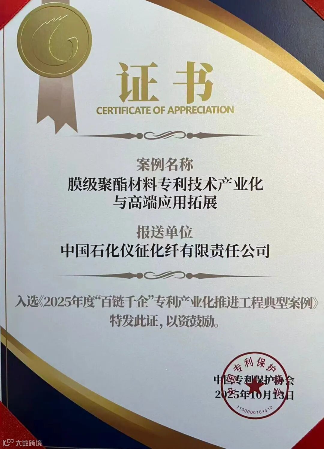 日前,中国专利保护协会对外公布20个2025年度“百链千企”专利产业化推进工程典型案例。中国石化仪征化纤报送的“膜级聚酯材料专利技术产业化与高端应用拓展”案例,成为中国石化唯一入选的全国20大典型案例;同时,该案例还入选了2025年度江苏省专利转化运用优秀案例。