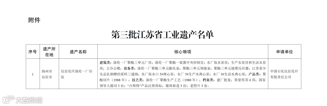 12月3日,从江苏省工业和信息化厅发布的《关于公布第三批江苏省工业遗产名单的通知》获悉,根据《江苏省工业遗产管理办法》规定审核程序,确定中国石化仪征化纤涤纶一厂旧址等13项为“第三批江苏省工业遗产”。