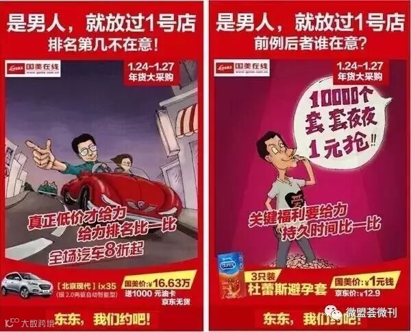 从表面上看,国美在线是替1号店说话,实际上是在暗讽京东。“跟牛奶较劲!伤不起!”、“男人应该比酒力”、“前例后者谁在意?”等文案针锋相对,调侃语气不言而喻。
