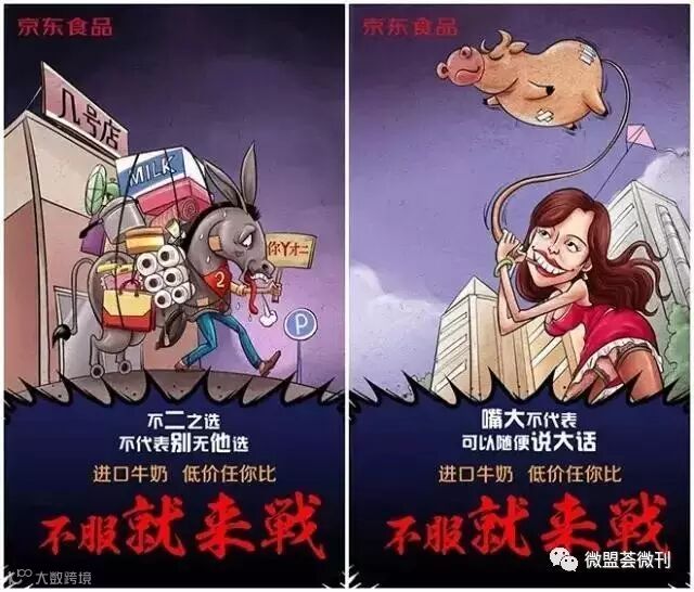 2015年1月,京东食品曝光了一组以“不服就来战”为主题的漫画。漫画主要讲京东进口牛奶售价全网最低,有不服的随时比价。不过漫画中提到的“史无前例”、“不二之选”以及“吉尼斯纪录“等词都是1号店之前的宣传文案。揭开京东食品跟1号店的文案大战序幕: