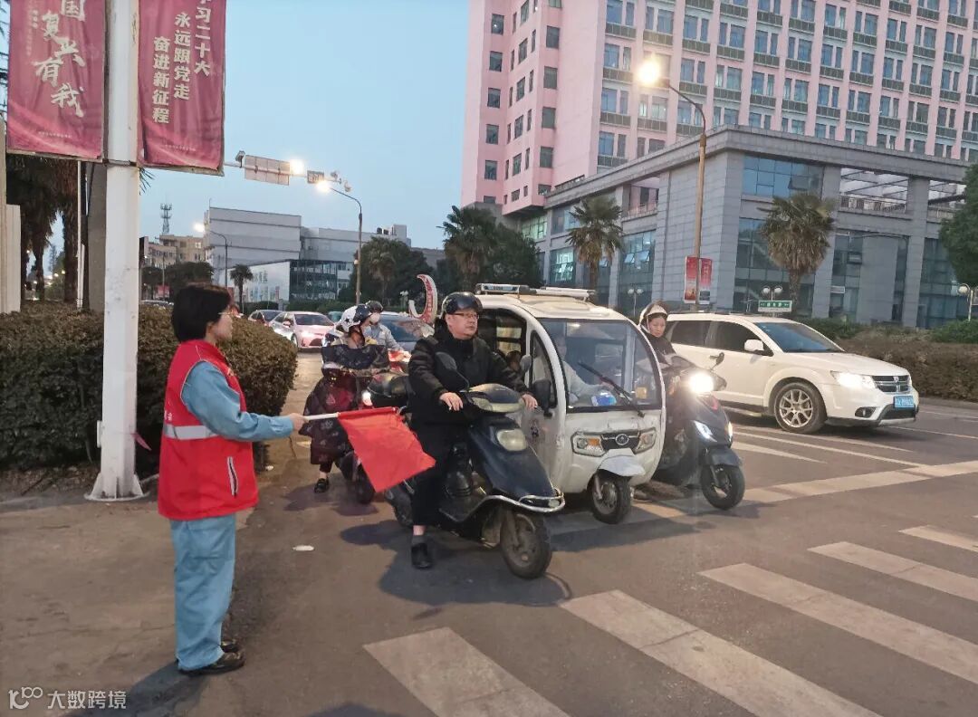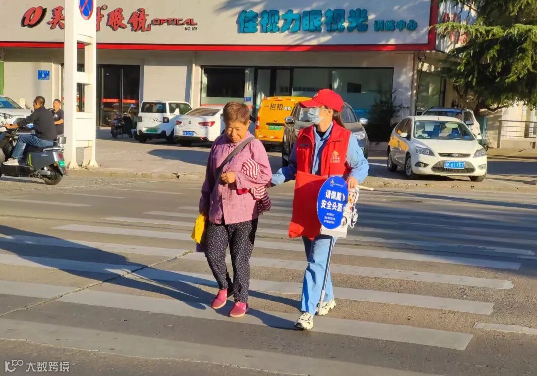 “骑电瓶车上路一定要戴安全头盔,要对自己的安全负责。”“大爷,现在是红灯,请等绿灯亮起再安全通行。”“奶奶,您是要过马路吗?我扶您过去吧。”