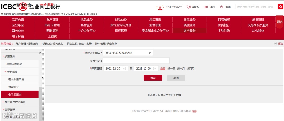 五、企网用户进入“客户服务-发票服务-电子发票-电子发票夹”菜单进行电子发票信息查询,输入相关查询条件后点击“查询”按钮进行电子发票信息查询。