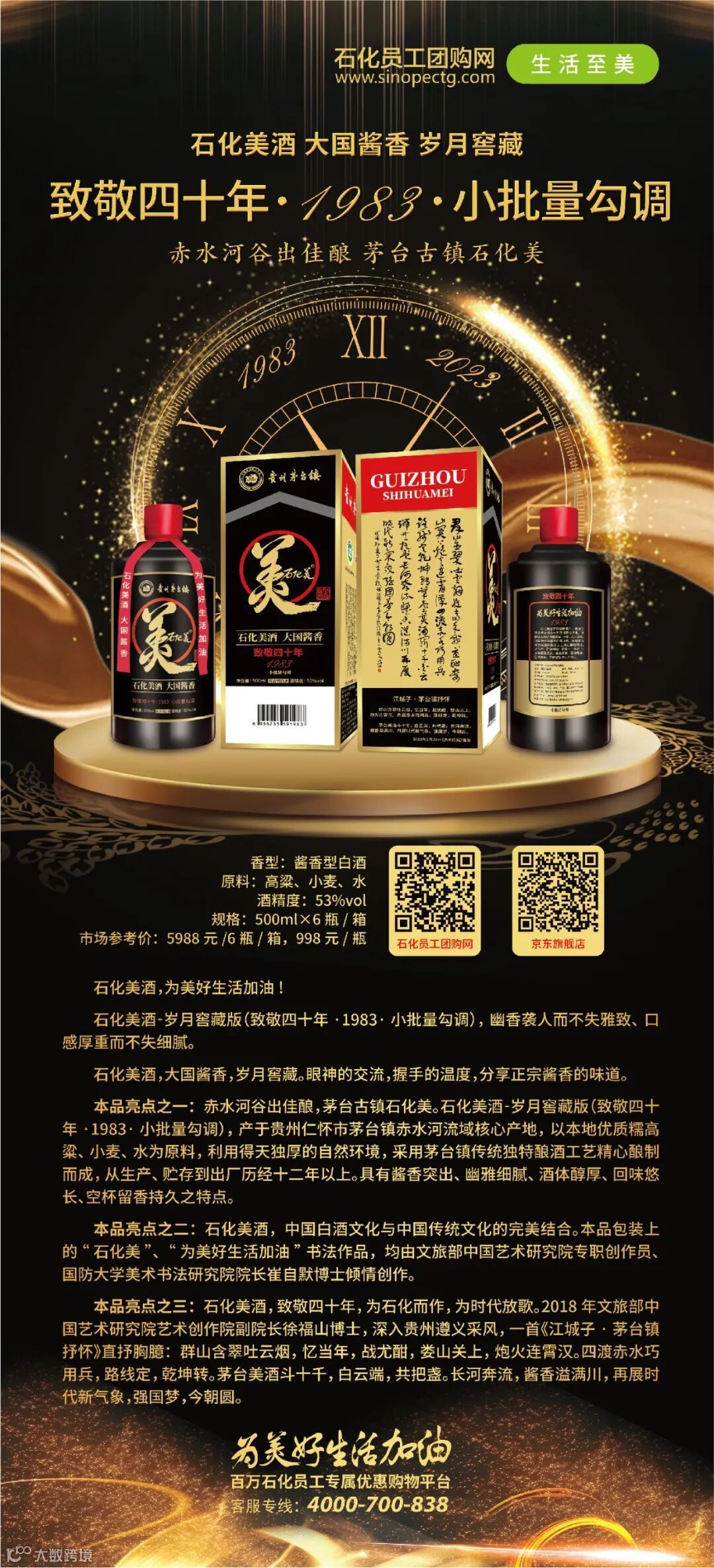 4月1日-7月12日,每天40箱,特惠秒杀100天!致敬四十年·1983·小批量勾调,“石化美”酒大国酱香岁月窖藏,为美好生活加油!赤水河谷出佳酿,茅台古镇石化美,茅台镇7.5平方公里核心产区,眼神的交流,握手的温度,分享正宗酱香的味道。