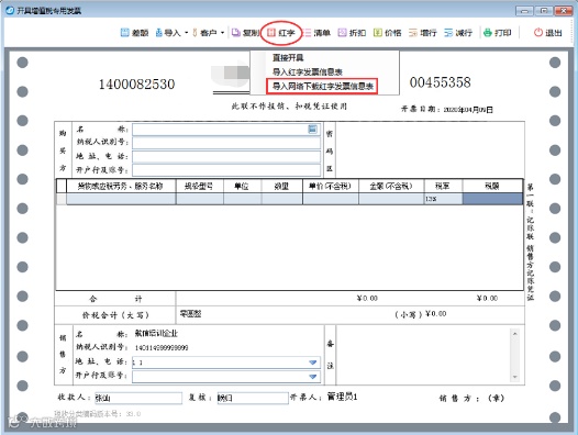6、进入增值税专用发票填开界面,点击上方“红字”,选择“导入网络下载红字发票信息表”;
