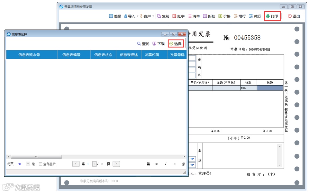 7、在弹出界面选择已上传的信息表,核实票面带出信息无误之后点击右上方“打印”即可。