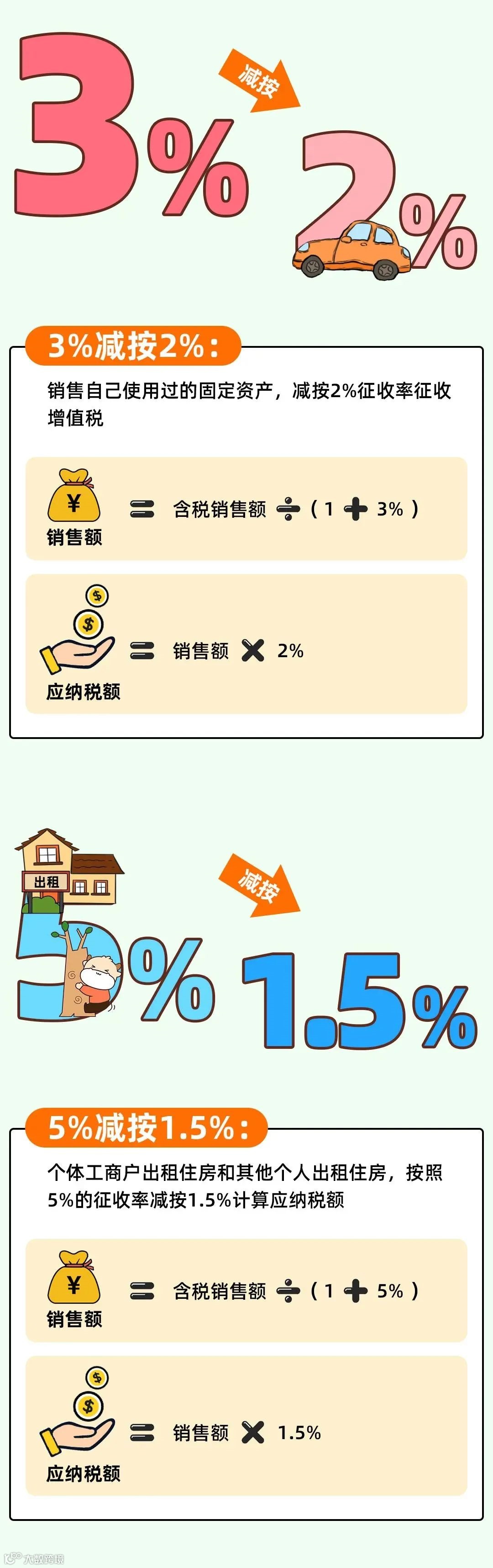 1、个体工商户和其他个人出租住房减按1.5%计算应纳税额。(国家税务总局公告2016年第16号)
