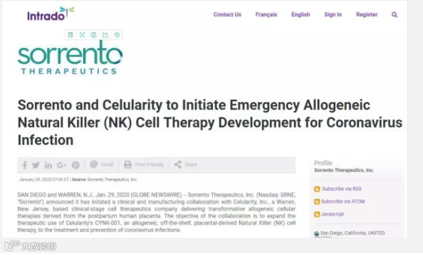 Sorrento制药公司与Celularity细胞治疗公司联合宣布启动临床合作,将名为CYNK-001的自然杀伤细胞疗法的用途扩展到治疗和预防冠状病毒感染,尤其是新型冠状病毒(2019-nCoV)。