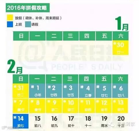 如果2016年2月1日至6日请假6天(也可用年假),就可以从2016年1月30日(周六)至2016年2月13日(周六),连休15天。