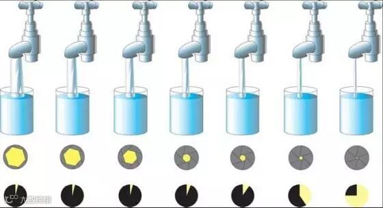水龙头开得越大(光圈越大),流水的时间就越短(快门越快)
