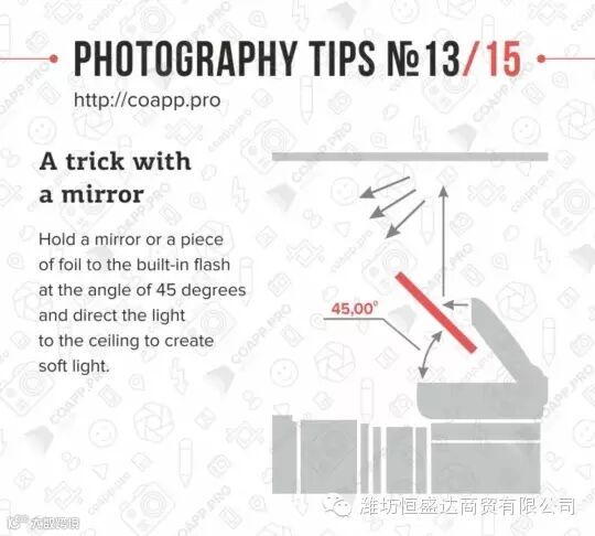 将一块镜或锡纸,放在相机的内置闪光灯前方成45°(如图),就可以将灯光反射到天花板,再反射到拍摄物件,形成更柔和的闪光。