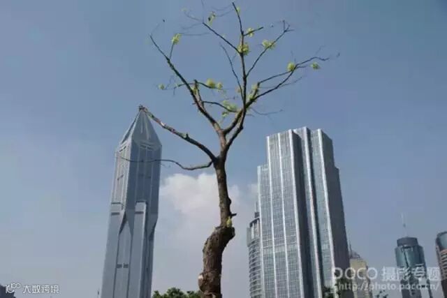 解释:注意不要使较为细长的被摄物,如:树木、电线杆、地平线、海平面等将画面一分为二。可以用露出树木根部,利用地平线一侧的山峦、建筑,海平面上的船舶、海平面和陆地连接处等来破解。另外,要注意地平线、海平面、及画面中较大的树木、电线杆等一定不要处于画面的正中,一般放在三分之一的位置上。下图为反面例子: