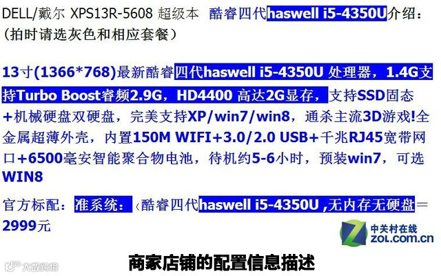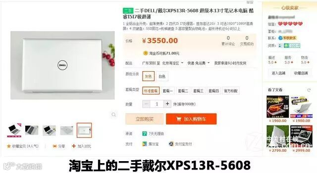 可能说到这里很多朋友不死心,认为翻新也无所谓,只要便宜就行,下面拿个实际例子给大家看。我在淘宝上找到了一款具体型号为XPS13R-5608的二手戴尔笔记本,灰色,标准套餐的价格为3550元。戴尔XPS13R-5608搭载第三代酷睿i5-3337U处理器、256GB固态硬盘,但这家二手店铺的配置信息却完全不同,竟然升级到了酷睿四代i5-4350U处理器同时支持双硬盘,而且在“官方标配”的说明里无内存无硬盘,显然有些此地无银三百两,这不明摆着告诉你这机器已经被我动过手脚了,选购需谨慎!这样的产品能买吗?