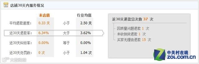 在淘宝上选购笔记本电脑无异于一场赌博,因此必然要细致、细致再细致,一家店铺近30天的服务情况也是一个重要的参考,务必仔细查看这家店铺近30天的退款率和投诉率,如果近30天退款率的数值大于行业均值或者退款总次数超过30的,那么毫不犹豫的关掉页面进入到下一家,毕竟这意味着这家产品的质量并不是那么过关。