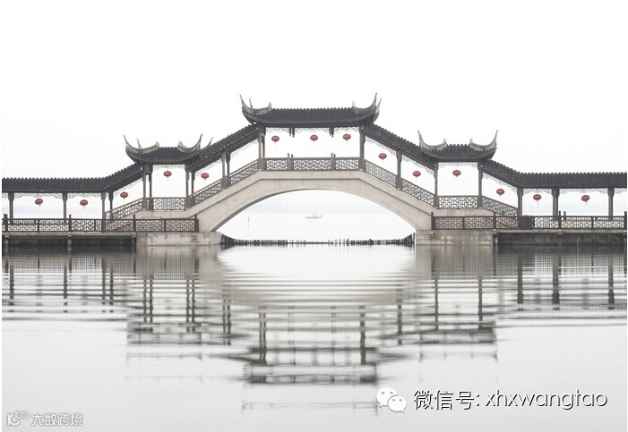 对称的构图中,水中的倒影不可不用,借斑斑的涟漪与清晰的桥面,营造出虚实相应的意境。