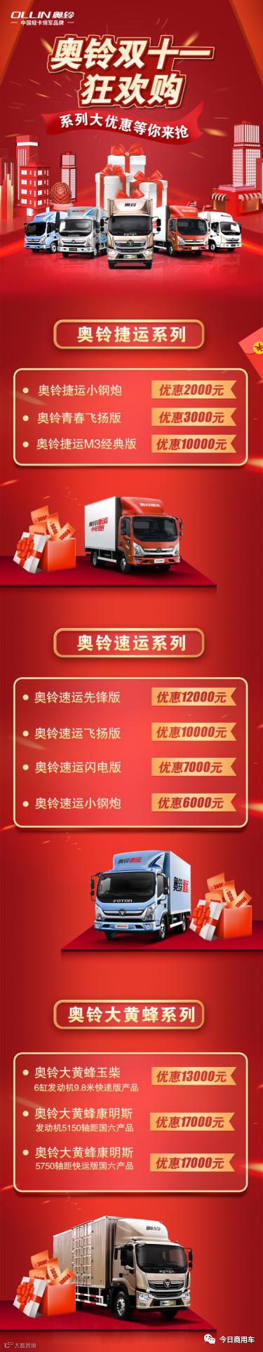 据了解,本次双十一,奥铃推出“奥铃双十一狂欢购 系列大优惠等你来抢”促销活动,优惠力度大,购车超值,最高优惠活动可达17000万元,其中包括,奥铃捷运系列、奥铃速运系列、奥铃大黄蜂系列等10款车型,迎战双十一,为卡车司机购车提供优惠。