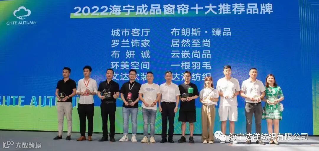 中高端成品窗帘抢抓机遇顺势而为,不断开拓创新,品牌效应不断外溢备,备受客户和市场青睐。在今年的海宁中国·国际家用纺织品博览会期间,一批颇具特色的中高端成品窗帘脱颖而出,达洋纺织成了“2022海宁成品窗帘十大推荐品牌”