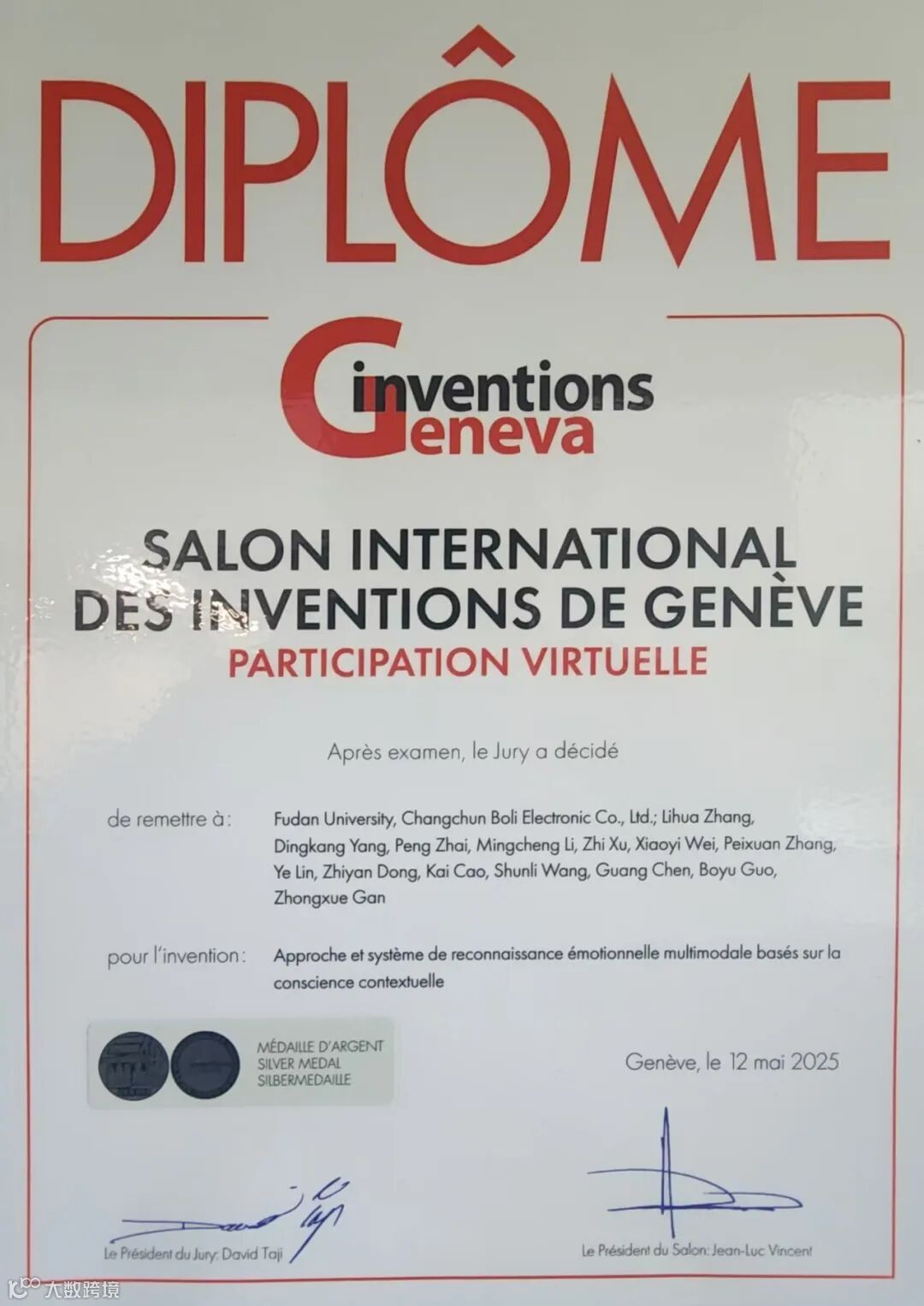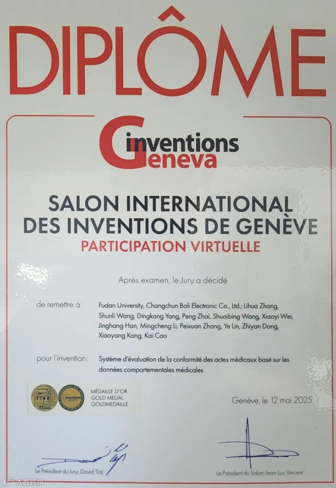 日前,长春博立电子科技有限公司与复旦大学在人工智能领域的合作研发创新成果-“基于医疗行为数据的医疗行为操作合规性评估系统”、“基于情境感知的多模态情感识别方法和系统”分别获第50届日内瓦国际发明展的金奖和银奖。