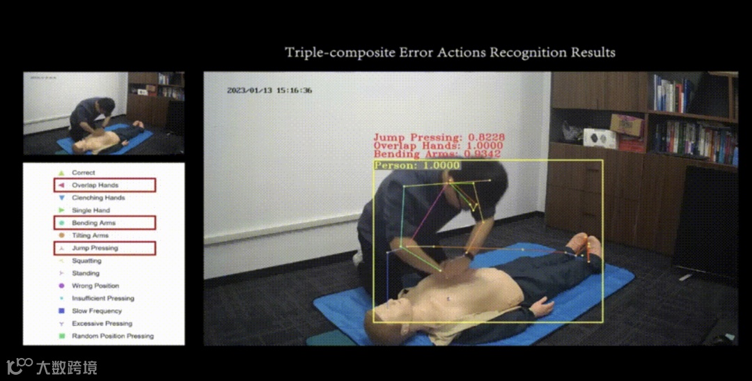 该发明分为医疗行为复合错误识别、医疗流程知识图谱动态匹配、医疗行为时序分割三个阶段。在医疗行为复合错误识别阶段中,该发明使用视觉特征组合训练机制,充分地利用单类错误样本进行特征组合训练,从而有效地提升了模型对复合错误样本的识别精度。进一步地,该发明将多模态对比预训练框架 CLIP与提示词工程引入到复合错误行为识别任务中,使系统具备了初步的人机交互能力。在医疗流程知识图谱动态匹配阶段,该发明使用 PURE算法对临床技能教材中的内容进行关系抽取,并以此构建了时序医疗行为知识图谱。在医疗行为时序分割阶段,该发明提出了基于时序聚类注意力机制的时序行为分割框架 kM-Att。同时,此阶段使用动态规整算法完成预测序列与标准序列的对齐,从而识别错误或遗漏的操作,完成序列动作的合规性检验。该发明在复合错误识别、多模态行为识别、时序动作分割等多种任务中性能突出,识别准确率领先于现有方法,且效率远高于人工识别。该发明以科技创新2030-“新一代人工智能”重大项目为依托,在200类医疗行为上实现了动作识别与合规性检测,已成功在CPR胸外按压、胸腔穿刺以及通用医疗行为在内的多个场景中实现了落地应用。