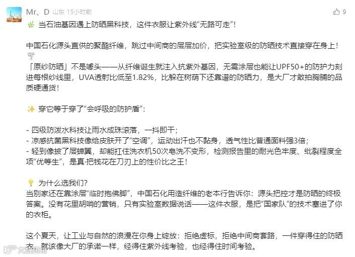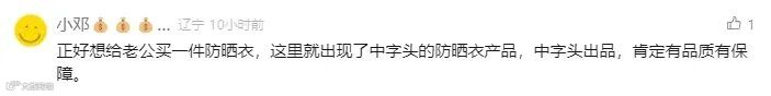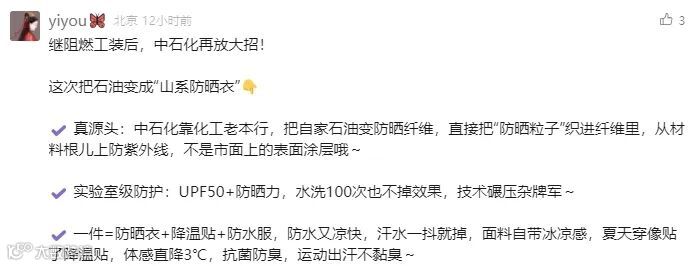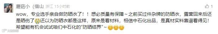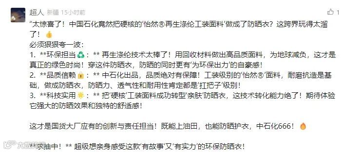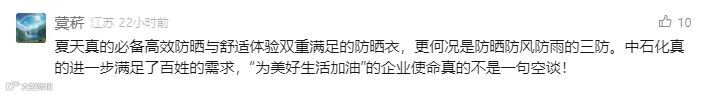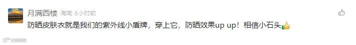 与山东网友的评论相似,这位北京的网友,应该是仪征化纤公司产品的“忠实粉丝”,仍然记得当年“爆款出圈”的阻燃工装。这次新上市的防晒皮肤衣,更适合大众日常生活与出行,是炎炎夏日防晒必备的不二之选。