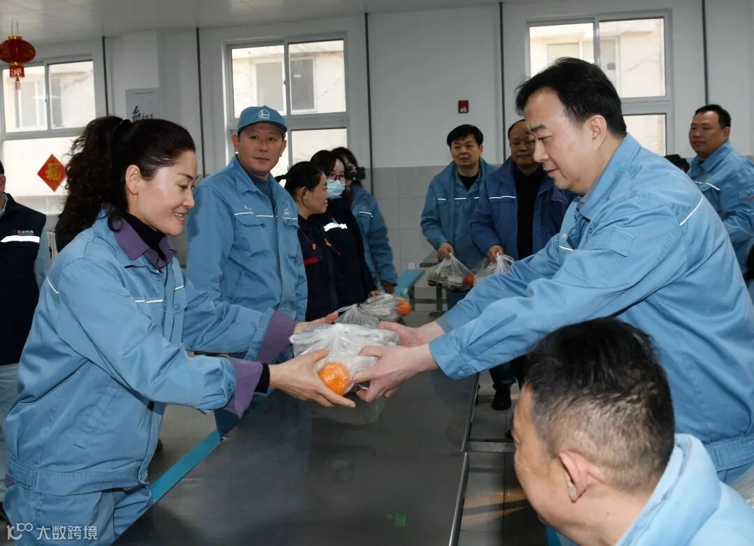 在高纤部后纺就餐区,毛绪国一行亲切地和每一位职工握手问候,把一份份热乎乎、香喷喷的年夜饭送到职工手中,向大家道一声“辛苦了”。