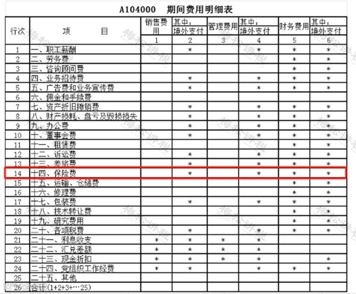 (2)《A104000期间费用明细表》第14行“保险费”填写错误