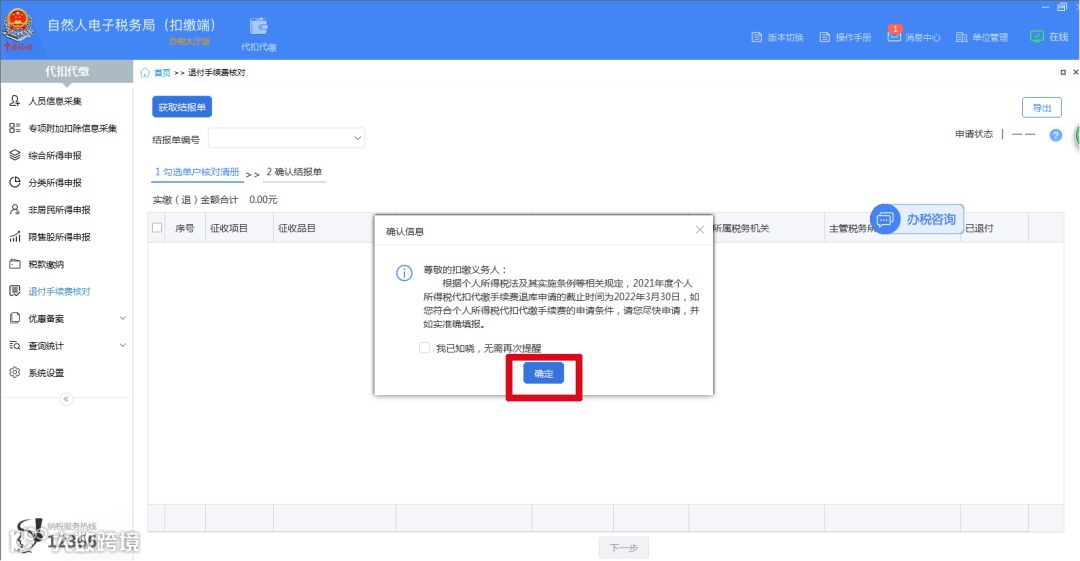 第二步:登录扣缴端后,在“代扣代缴”界面,点击左侧菜单“退付手续费核对”