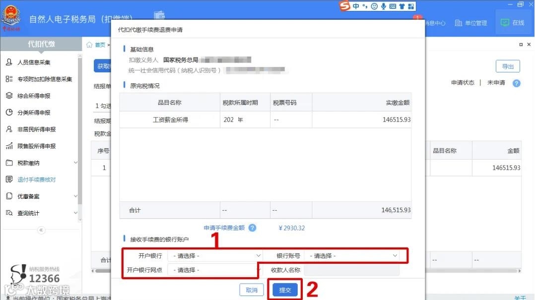 第五步:在【代扣代缴手续费退费申请】中依次选择“开户银行”、“银行账号”【提交】。