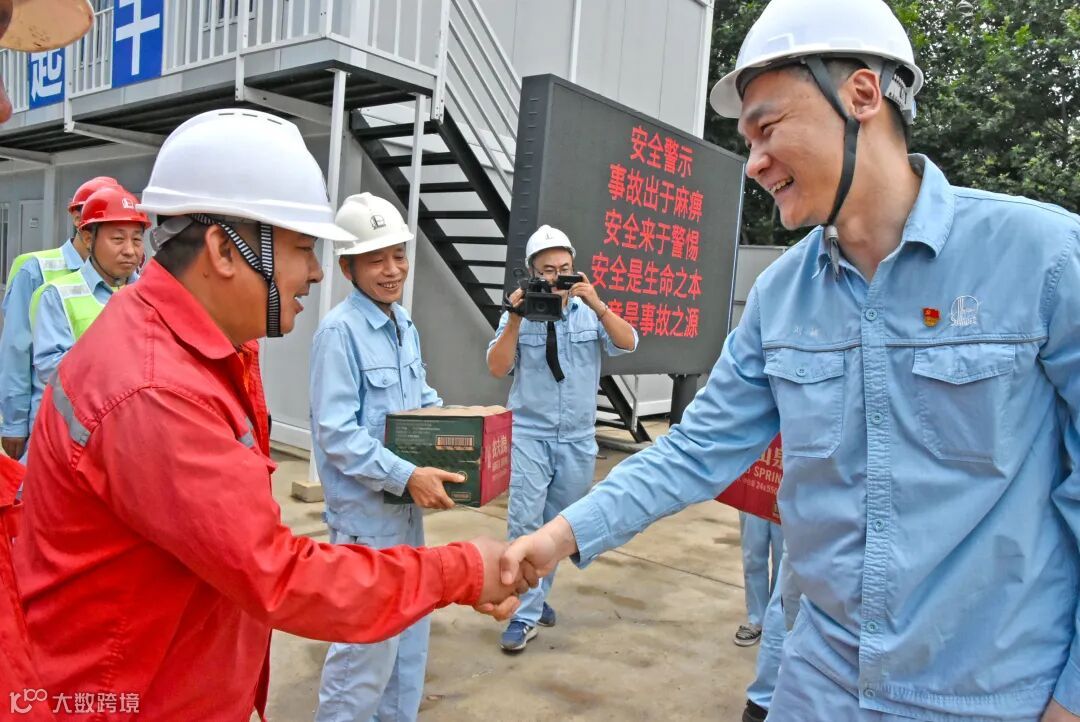 在年产23万吨智能化短纤项目建设现场,刘楠与参建单位干部职工一一握手并向他们送上矿泉水,感谢大家在高温、闷热天气里依然每天挥汗如雨奋战在项目建设工地上。