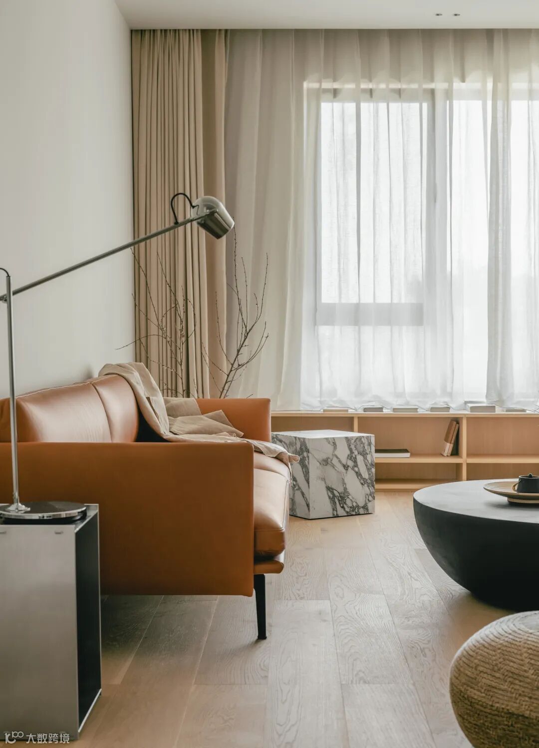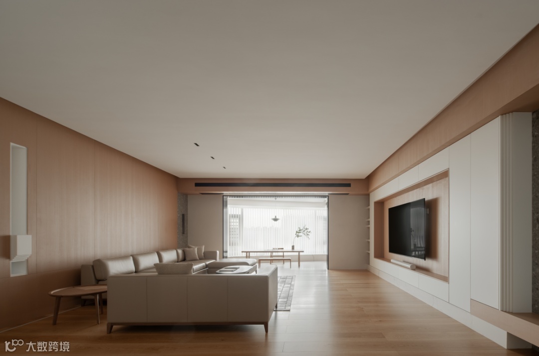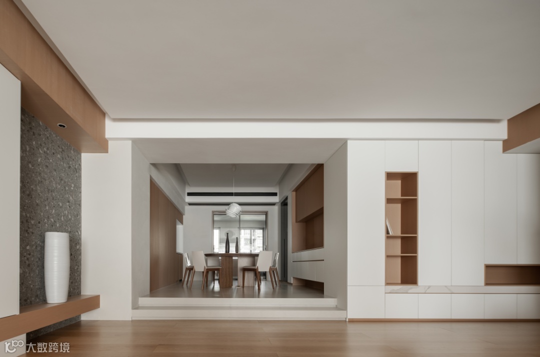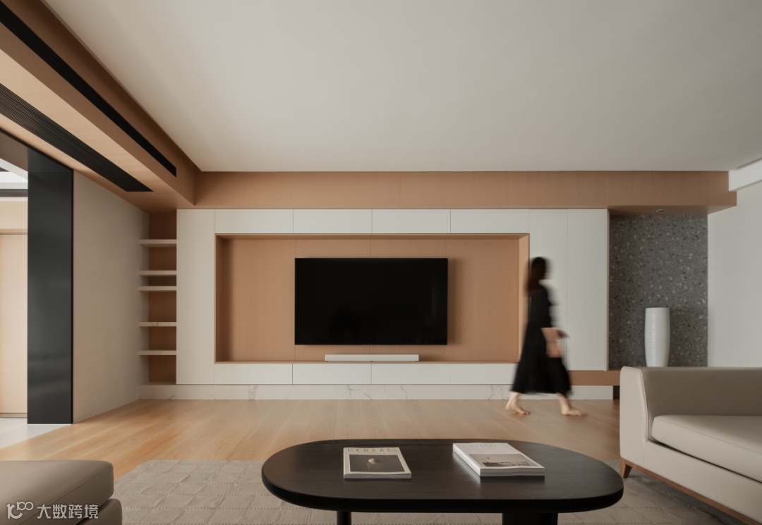 包容、广阔、温煦的空间力量,始于树木的生长印记,大面积铺陈原木材质,碰撞留白的意境,启阅客厅的篇章。墙面采用木饰面与水磨石材质,搭配叠层、透景、穿插、解构的手法,让空间更加自然与宁静。