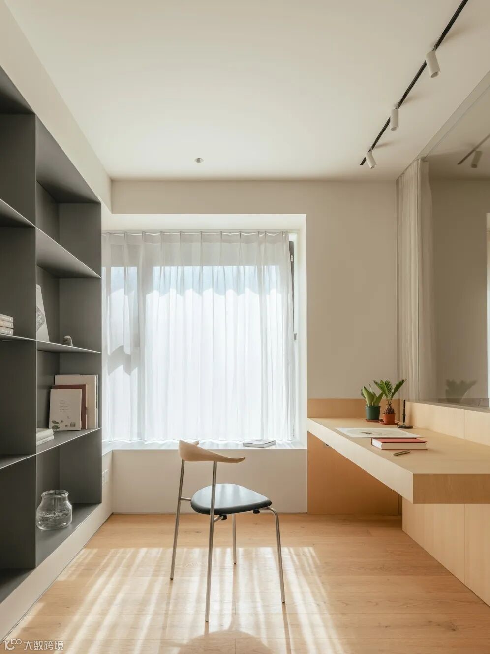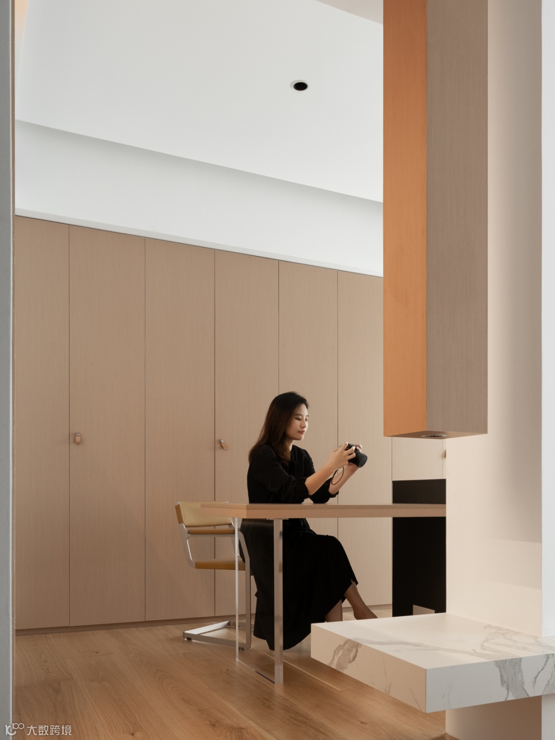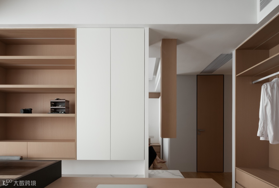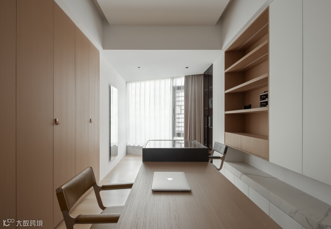 把书房融入衣帽间,以全新的叙事角度丰盈起居生活,由隔断延伸出的大理石台面,与从顶面垂下的木质结构形成透景框架,悦活了内外过渡的视觉乐趣,消弭了场域转换的生硬感。沉稳岛台将长形桌面分为两部分,亚克力桌腿展露了轻盈通透的美。