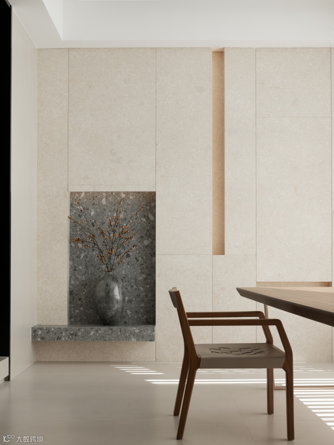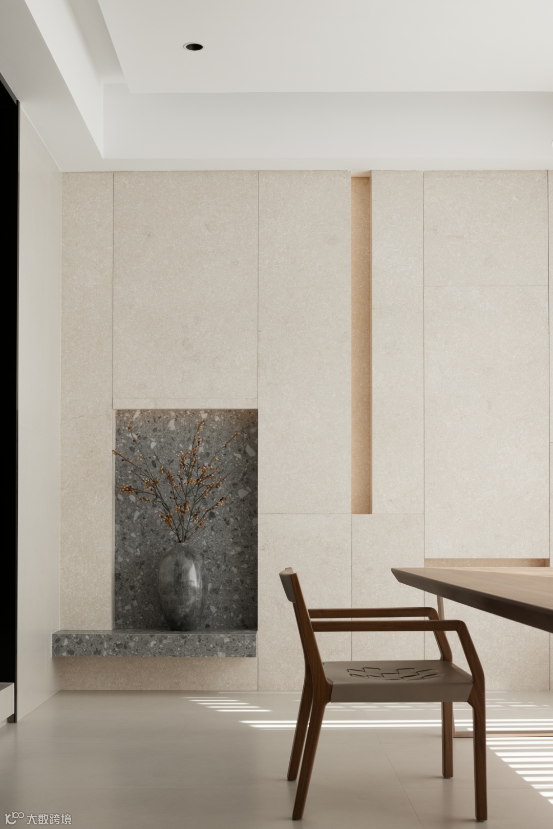 步入私域,空间氛围予人净化感,中灰、木色、柔白相互叠加、穿插、交织,打造出松弛又安稳的秩序感,甄选灰调大理石密合质朴基调,以仿若云烟的纹理亲近自然,在横竖转折的廓形中言明空间内在的联系。