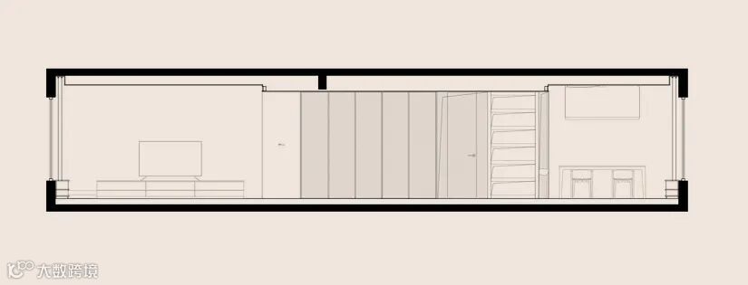 设计中的一个微妙但具有战略意义的干预措施是微型水泥展示柜和木制存储单元,它们既是分隔物,也是家中的互动元素。这些结构位于双路径的连接处,创造了动态的交叉点,家庭互动可以自发发生。此外,它们与相邻墙壁的轻微偏离为空间引入了引人入胜的节奏,打破了最初布局的单调,带来了更轻松、更流畅的空间叙事。