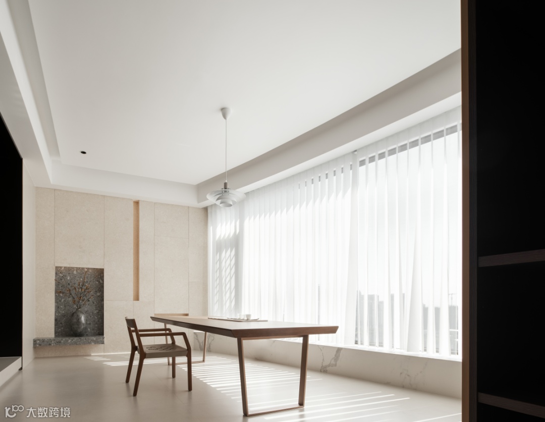 入门便可感受空间结构带来的魅力,联结自然光影重塑意蕴,强调了归静的目的。描摹纯白色块,凸显立面功能,水磨石与大理石形成凹凸错落的造型,好似空间的琴键,光与风受邀入室,拨动了空间的乐曲。