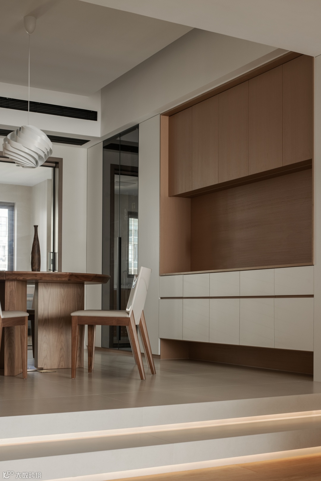以简约纯净的空间基调,营造舒适、宁静、自然的居住环境。建构两层台阶,用行径的变化体现跃迁的仪式感,同时划分不同区域,拓展空间层次与艺术张力。就餐的场景散发着温馨的氛围,从厨房透过来的光,让境与情自在交融。