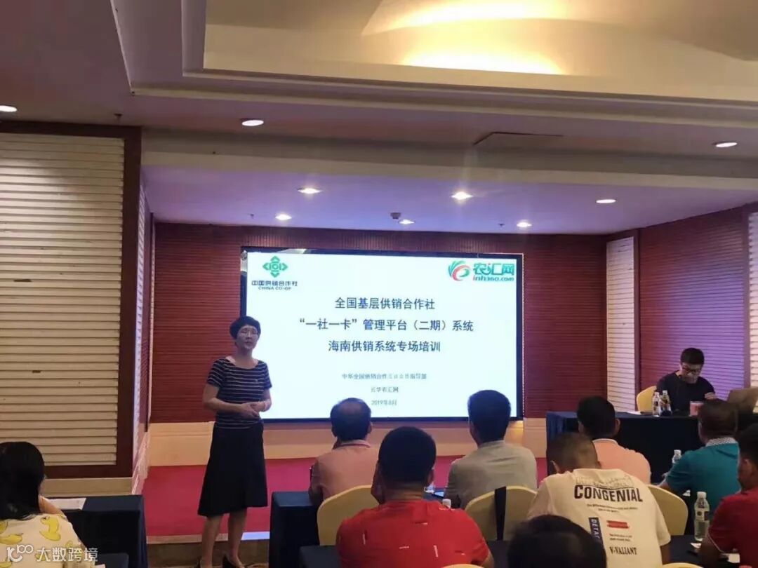 会议由海南省社合作指导处处长许培英主持召开,海南省社符芳海副主任出席会议并讲话,他首先传达了总社的全国基层社工作会议精神,然后总结了2019年度上半年的整理工作,最后对本次培训作出了几点要求。随后农汇培训师黄泓曾老师主讲,介绍了《全国基层供销合作社“一社一卡(二期)”管理平台操作手册》。