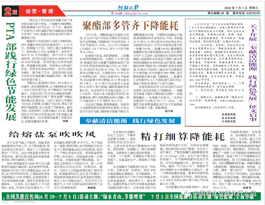 为贯彻落实国家发展改革委等14部委联合下发《关于开展2020年全国节能宣传周和全国低碳日活动的通知》,中国石化仪征化纤公司于2020年6月29日至7月5日开展全国节能宣传周(7月2日全国低碳日)活动。