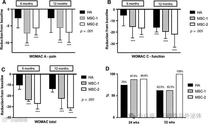 图:疗效结果。(A–C):各组与基线的比较。(一):WOMAC疼痛量表。(二):WOMAC‐C功能量表。(C):总WOMAC。(D):OMERACT‐OARSI响应者指数标准。简称:HA,玻尿酸;间充质干细胞;WOMAC:关节炎指数。