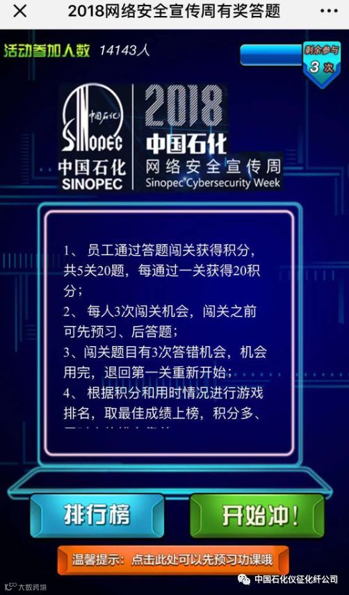 2018中国石化网络安全宣传周有奖答题正式开始啦!员工朋友们进入“奋进石化”点击“2018网络安全宣传周有奖答题”子栏目即可参与哦~