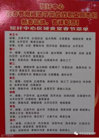 1月27日下午5点,公司总经理卢立勇带领相关部门负责人,来到短纤中心食堂,看到的是品种丰富、热气腾腾年夜饭和精心准备的节日菜谱。