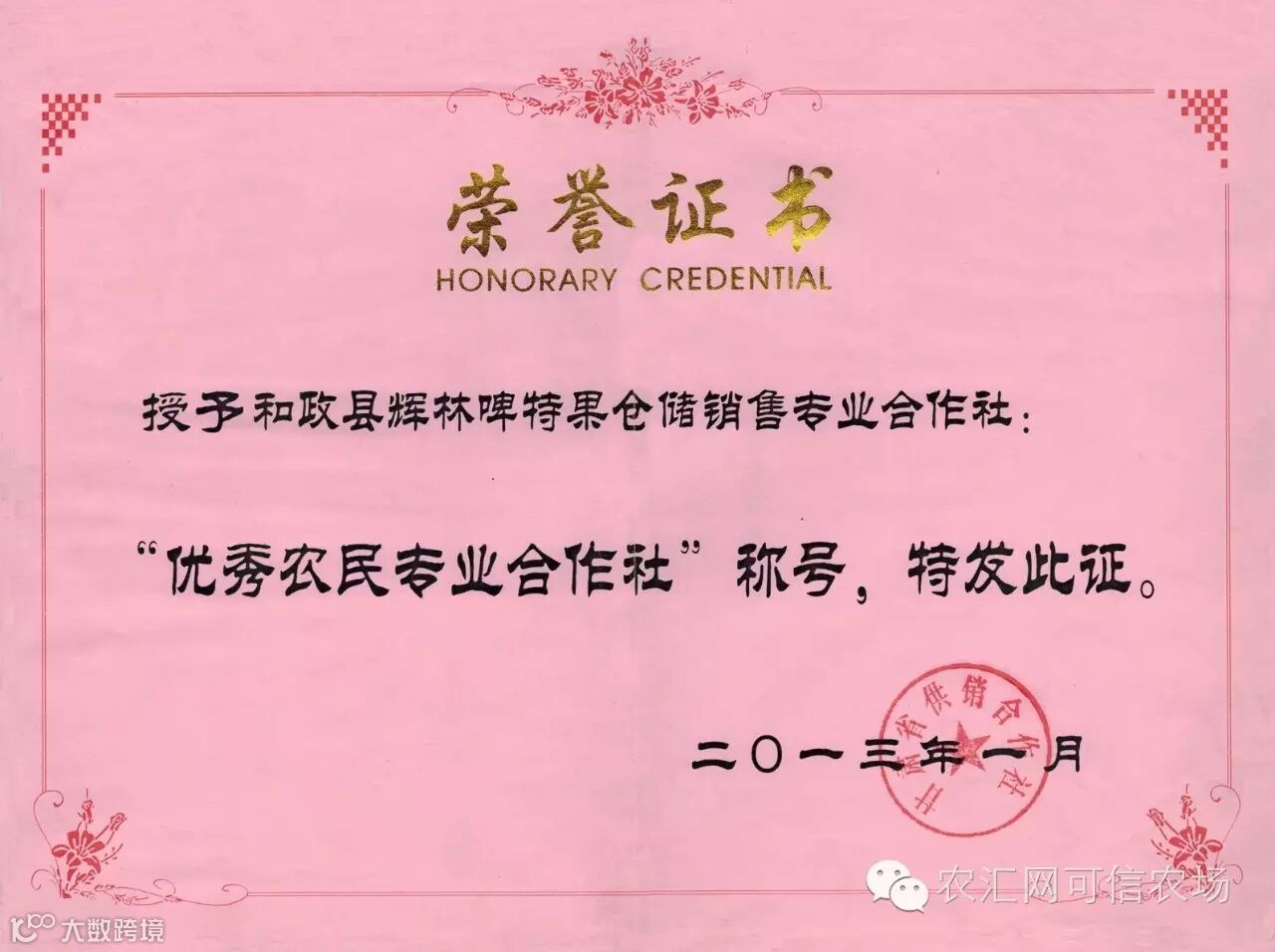 和政县辉林啤特果仓储销售专业合作社于2009年10月成立,驻地三合镇尕新庄村,由啤特果种植大户、运销大户,按照“民办、民管、民受益”和“自愿、互利、平等”的原则,由县林业局帮助指导,2011年6月在县工商行政管理局的注册登记。合作社现有社员104人,选举曹辉为理事长,理事5名,制定了章程,建立了各项管理制度,合法诚信经营。
