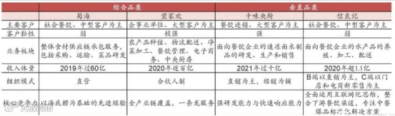 垂直品类、小b客户型:主要服务非连锁的中小餐饮企业,食材品类方面,往往专注于几个小品类,走大单品路线。