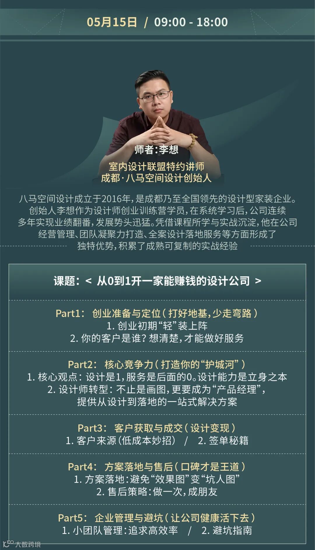 室内设计联盟独家研发,专门针对设计师创业者痛点的课程,几位讲师的分享只针对室内设计联盟平台。