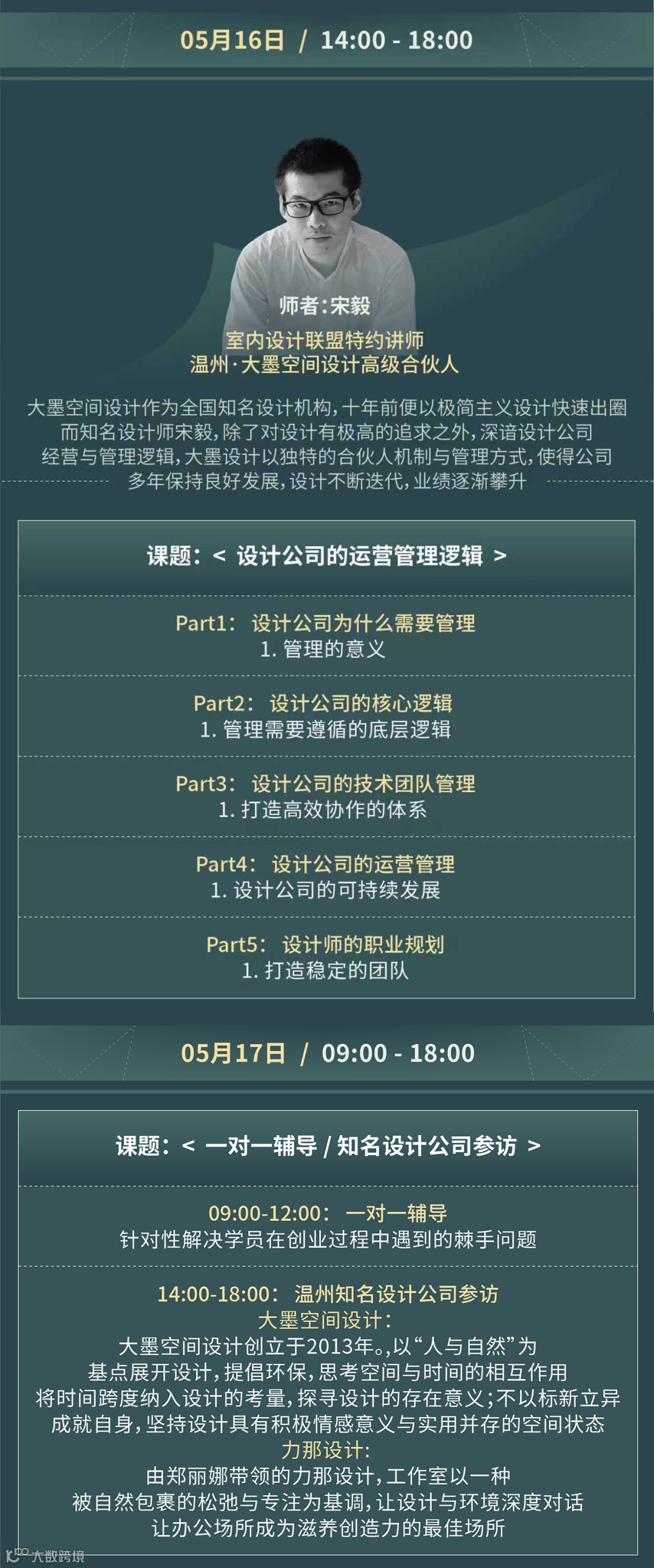 本课程以白天授课,晚上深度互动,以及设计公司参访学习结合的方式,领悟优秀设计公司运营管理与发展逻辑。