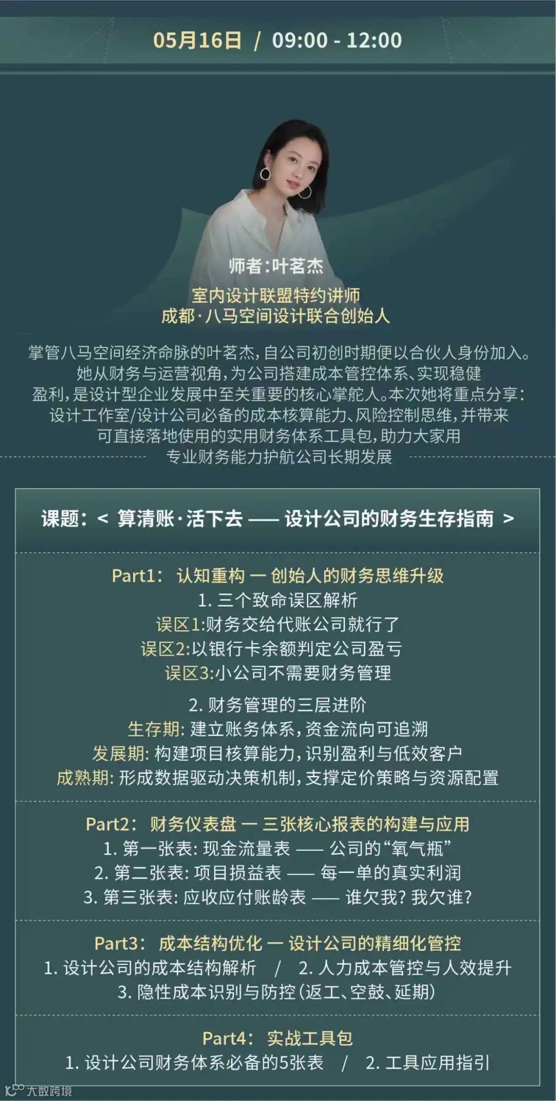 针对设计公司的核心痛点:管理,运营,获客,全案,交付等维度展开,深度分享方法论,能快速应用并落地。