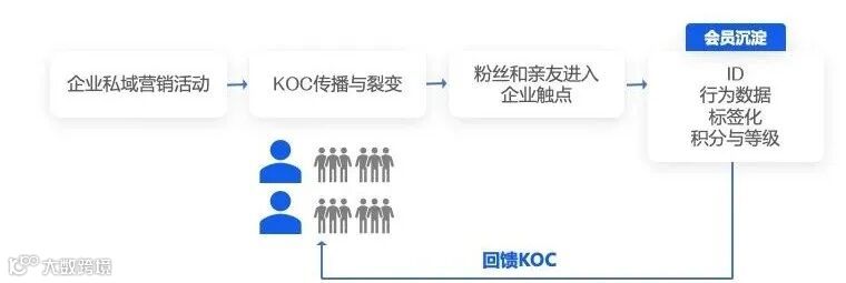 品牌通常邀请多位 KOC 作为企业私域营销活动的裂变发起者和传播推手,以聚拢KOC 的粉丝与亲友进入品牌触点。而这些触点跟前面所讲的那些触点并无二致,品牌可以在这些触点上捕捉 KOC 引来的消费者的ID与各种行为数据,从而为实现之后的各种深度运营创造条件。B2KOC2C方式如图所示。