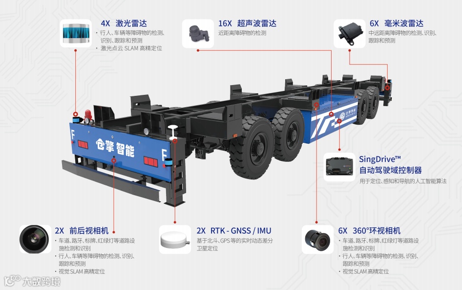 作为较早关注港口无人驾驶作业的企业,仓擎智能不仅拥有深厚的研发能力,还对港口无人驾驶作业有着独到的见解。仓擎智能打造无人驾驶水平搬运平板车集成了纯电动IGV底盘和自动驾驶系统,IGV底盘大量采用特种车底盘的成熟技术,包括大承载车体设计及制造技术,多轴承载轴荷平衡技术,多轴同步转向技术以及涂装工艺等,保证高度的技术可靠性及产品质量,采用新能源动力驱动技术和无轨定位导航技术,与一般的磁导重载AGV相比,更加柔性智能。可适应各类型港口码头,无需轨道、磁钉定位技术,不完全依赖GNSS信号。单次可承载2×20英尺标准集装箱的运输,满载最大时速25km/h。可在对码头现有环境不做任何改造的条件下,满足客户多方面需求。