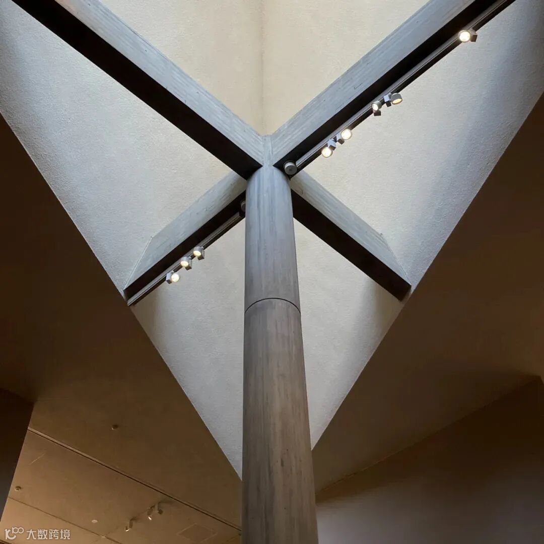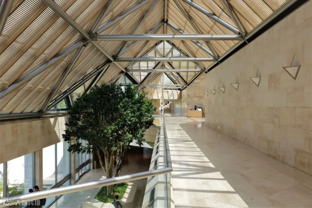 美术馆自身的建筑全然是贝聿铭的风格,大师驾驭几何图形与光影向来是得心应手。大门口的正圆玻璃与三角形屋顶,一眼便能瞧出其中的巧思。整个屋顶为立体框架结构,由三角形以几何学方式组合而成,晴天时,光影变幻,给整个空间增添了更多层次与线条。